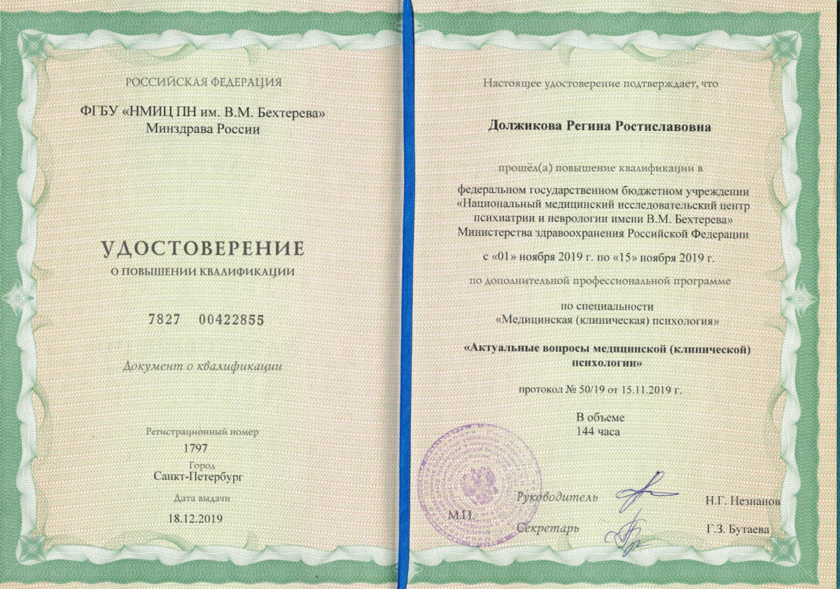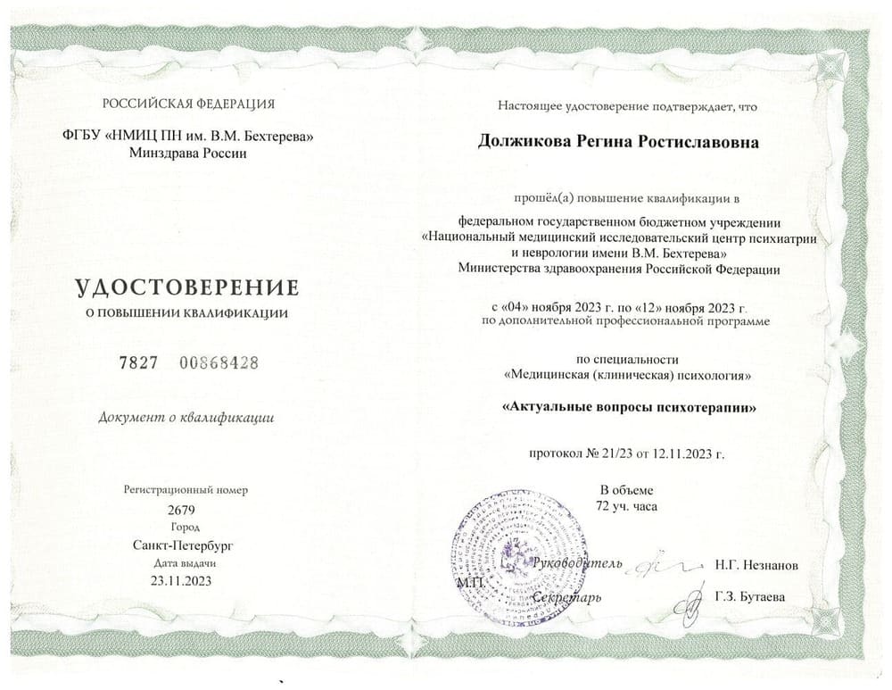 - Получена специализация «Психотерапия невротических состояний» в рамках курса повышения квалификации в 2012 году в Санкт-Петербургском научно-исследовательском психоневрологическом институте им. В.М. Бехтерева (очно).