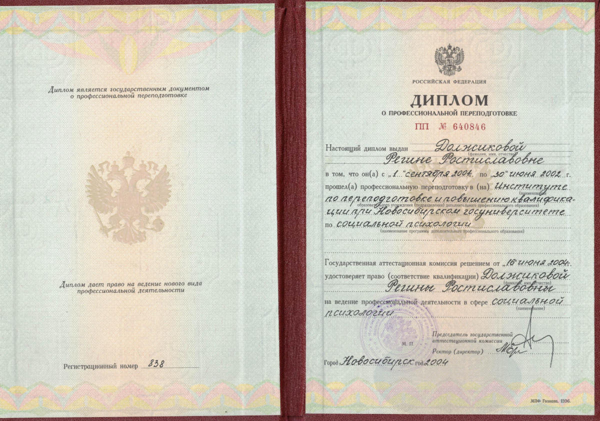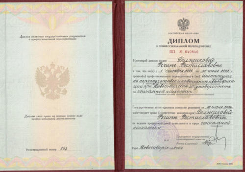 - Профессиональная переподготовка в 2004 году по специальности «Социальная психология» в Новосибирском Государственном университете (очно).