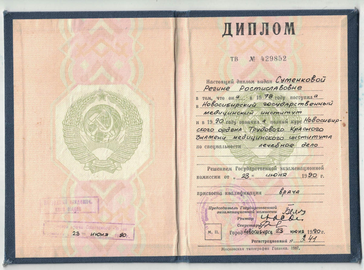 - Окончила в 1990 году Новосибирский Государственный медицинский институт по специальности «лечебное дело».