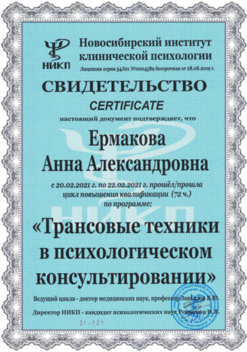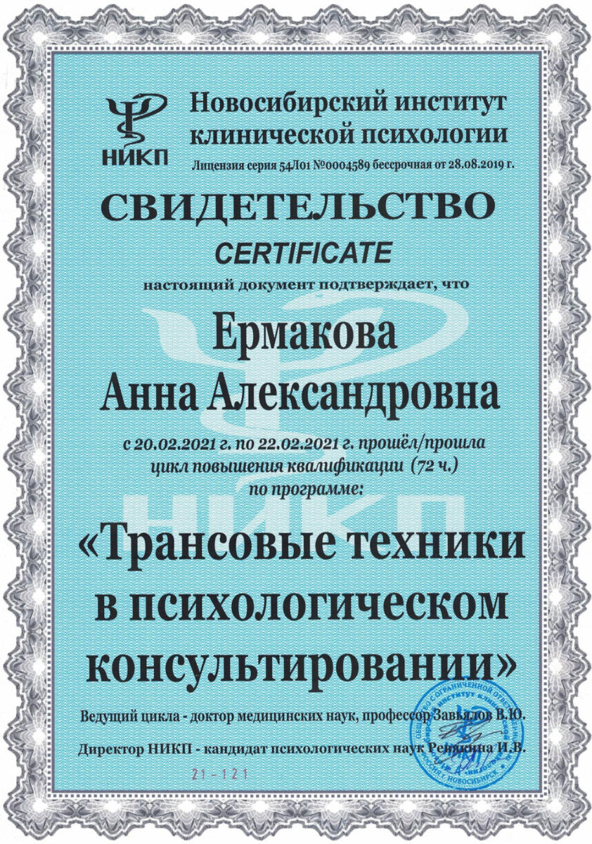 курс повышения квалификации на учебно-практических семинарах по темам: «Кататимно-имагинативная психотерапия тревожных расстройств, панических атак и фобий»; «Развитие эротического вожделения, сексуальные мотивы в символдраме, эротический и эротизированный перенос и контрперенос»; «Психоаналитическая диагностика»; «Кататимно-имагинативная психотерапия в работе со сложными нарциссическими расстройства»; «Психотерапия психосамотических и депрессивных расстройств при помощи методов символдрамы»; «Психоанализ талисмана – образ как посредник между чувственным восприятием и внутренним опытом. Работа с кататимными предметами». Осуществляет консультативно-терапевтическую практику в подходе по методу символдрама.
