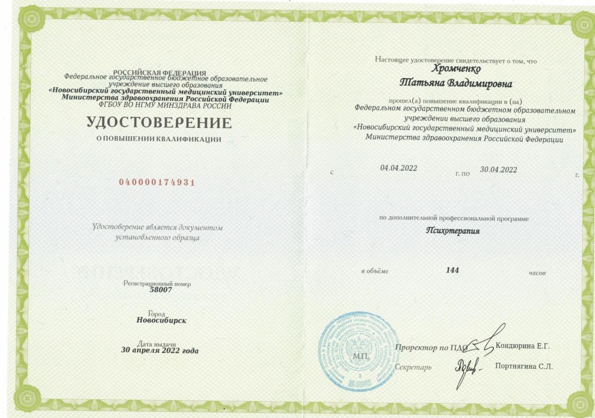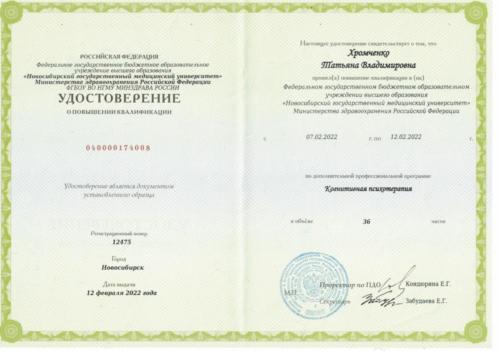 В 2012 году получила дополнительное образование в Санкт-Петербургском Государственном медицинском университете им. М. И. Мечникова по специальности Психотерапия.