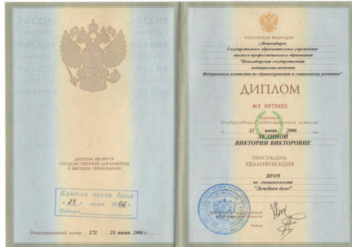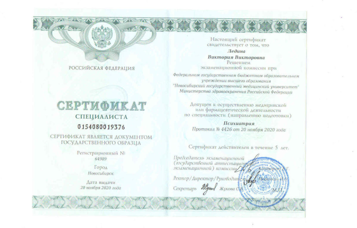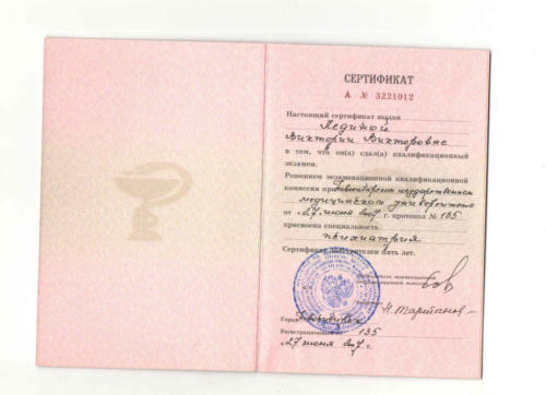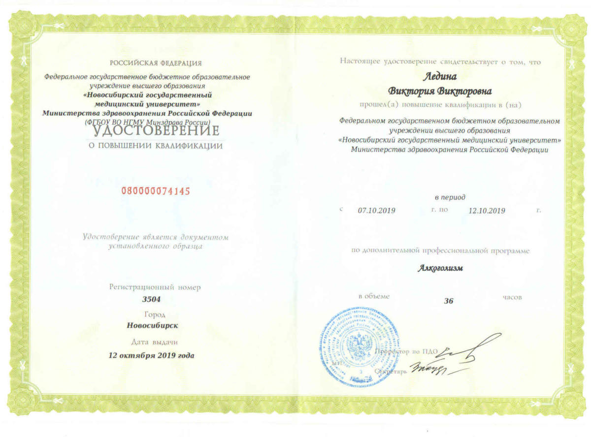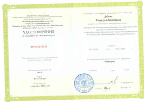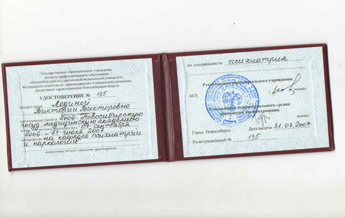 Интернатура на кафедре психиатрии, наркологии и психотерапии НГМУ. Специальность — психиатрия.