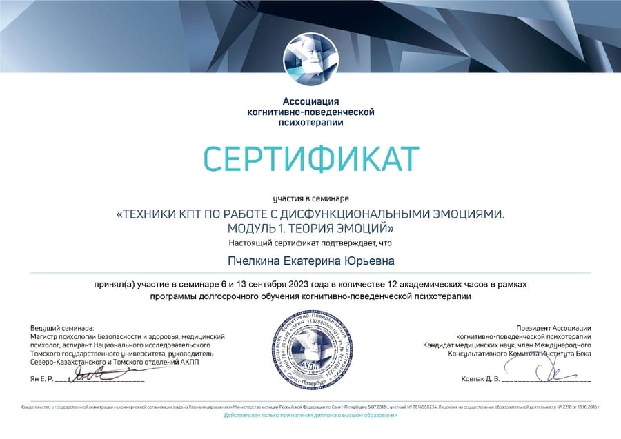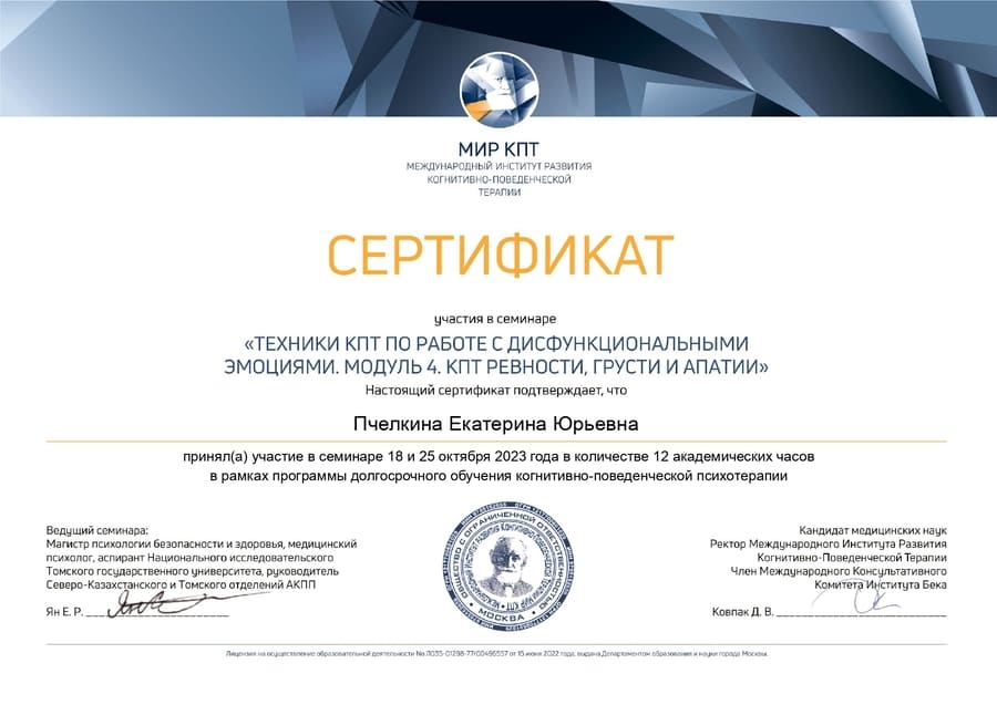 2023 г. Международный институт развития Когнитивно-поведенческой терапии «Техники КПТ по работе с дисфункциональными эмоциями»;