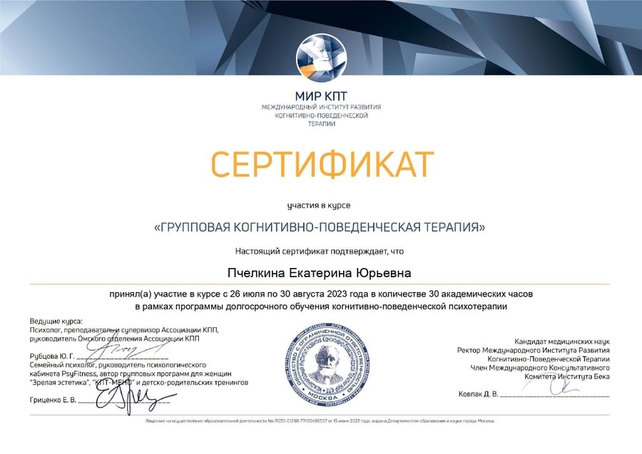 2023 г. Международный институт развития Когнитивно-поведенческой терапии «Групповая когнитивно-поведенческая терапия»;