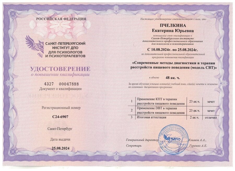 2024 г. Санкт-Петербургский институт ДПО для психологов и психотерапевтов «Современные методы диагностики и терапии расстройств пищевого поведения (модель CBT)»;