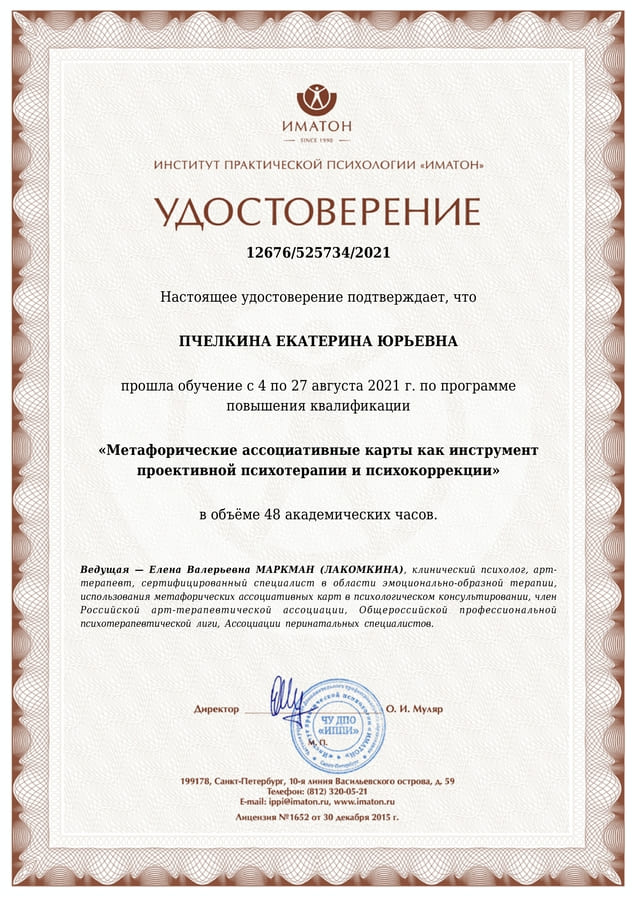 2021 г. Институт практической психологии «Иматон» «Метафорические ассоциативные карты как инструмент проективной психотерапии и психокоррекции»;