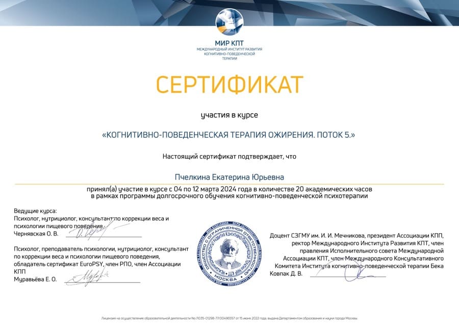 2024 г. Международный институт развития Когнитивно-поведенческой терапии «Когнитивно-поведенческая терапия ОЖИРЕНИЯ» (КПТ-О);