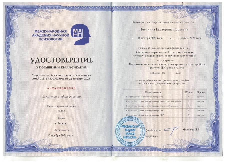 2024 г. Международная академия научной психологии «Когнитивно-поведенческая терапия тревожных расстройств (протокол Д. Кларка и А. Бека)»;