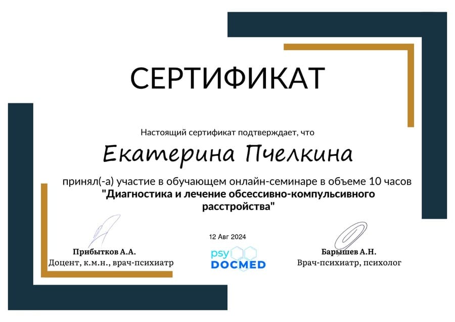 2024 г. PSYDOKmed «Диагностика и лечение обсессивно-компульсивного расстройства»;