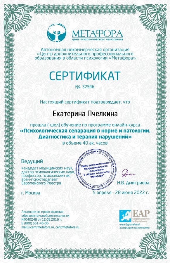 2022 г. Институт интегративной психологии «Метафора» «Психологическая сепарация в норме и патологии. Диагностика и терапия нарушений» (курс к.м.н., доктора психологических наук Дмитриевой Н.В.);