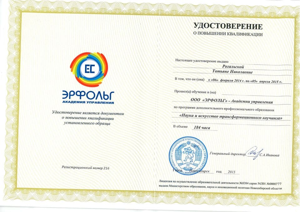 2014 г. – по программе повышения квалификации «Трансформационный коучинг» Акаденмия управления Эрфольг