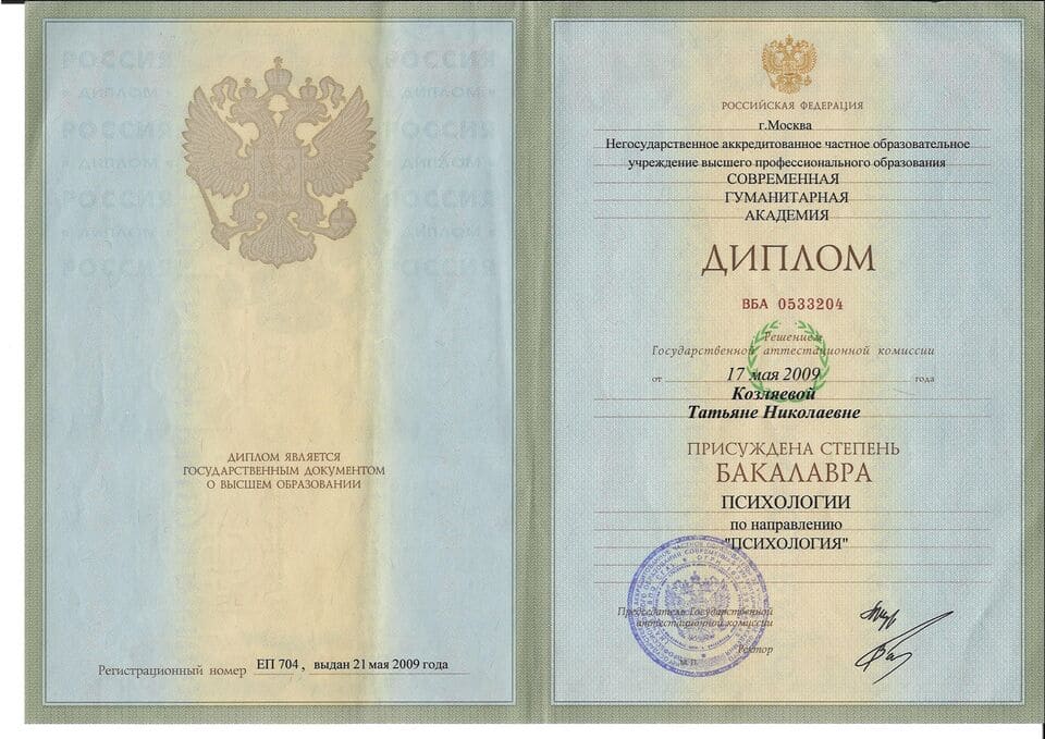 2008 г. — Современная гуманитарная академия, факультет «Психология»;