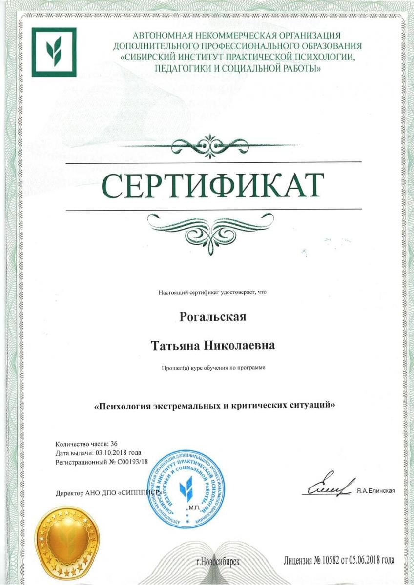2018 г. – по программе «Психология экстремальных и критических ситуаций», АНО ДПО «Сибирский институт практической психологии, педагогики и социальной работы»;