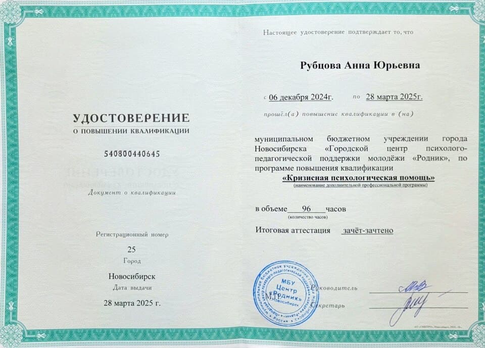 2025 г. — «Городской центр психолого-педагогической поддержки молодёжи «Родник», по программе повышения квалификации «Кризисная психологическая помощь».