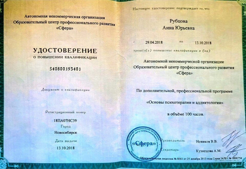 2018 г. — Автономная некоммерческая организация Образовательный центр профессионального развития «Сфера» «Основы психотерапии и аддиктологии»;