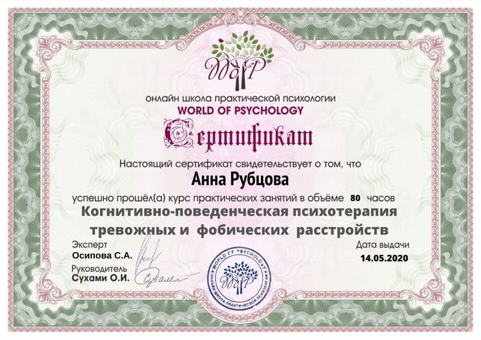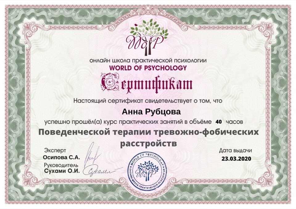 2020 г. — Онлайн школа практической психологии World of psychology «Когнитивно-поведенческая психотерапия тревожных и фобических расстройств» и «Поведенческая терапия тревожно-фобических расстройств»;