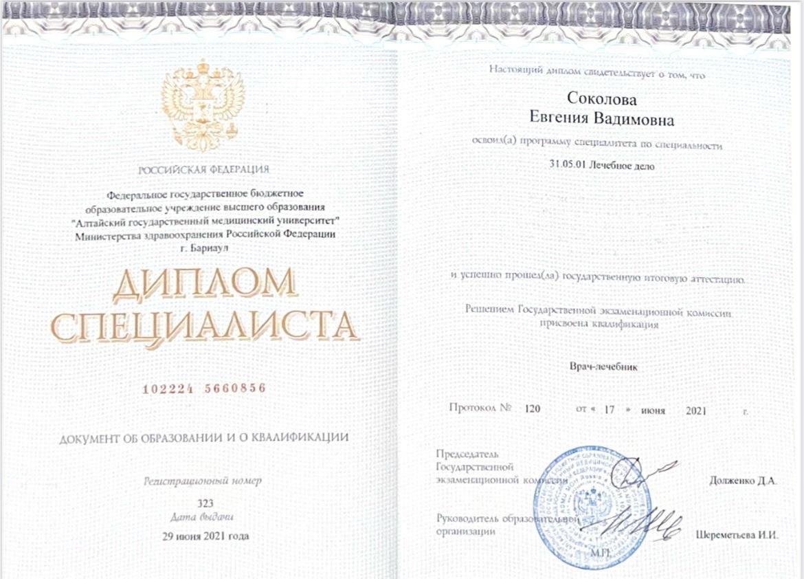 2021 г. — Алтайский государственный медицинский университет, факультет «Лечебное дело»;