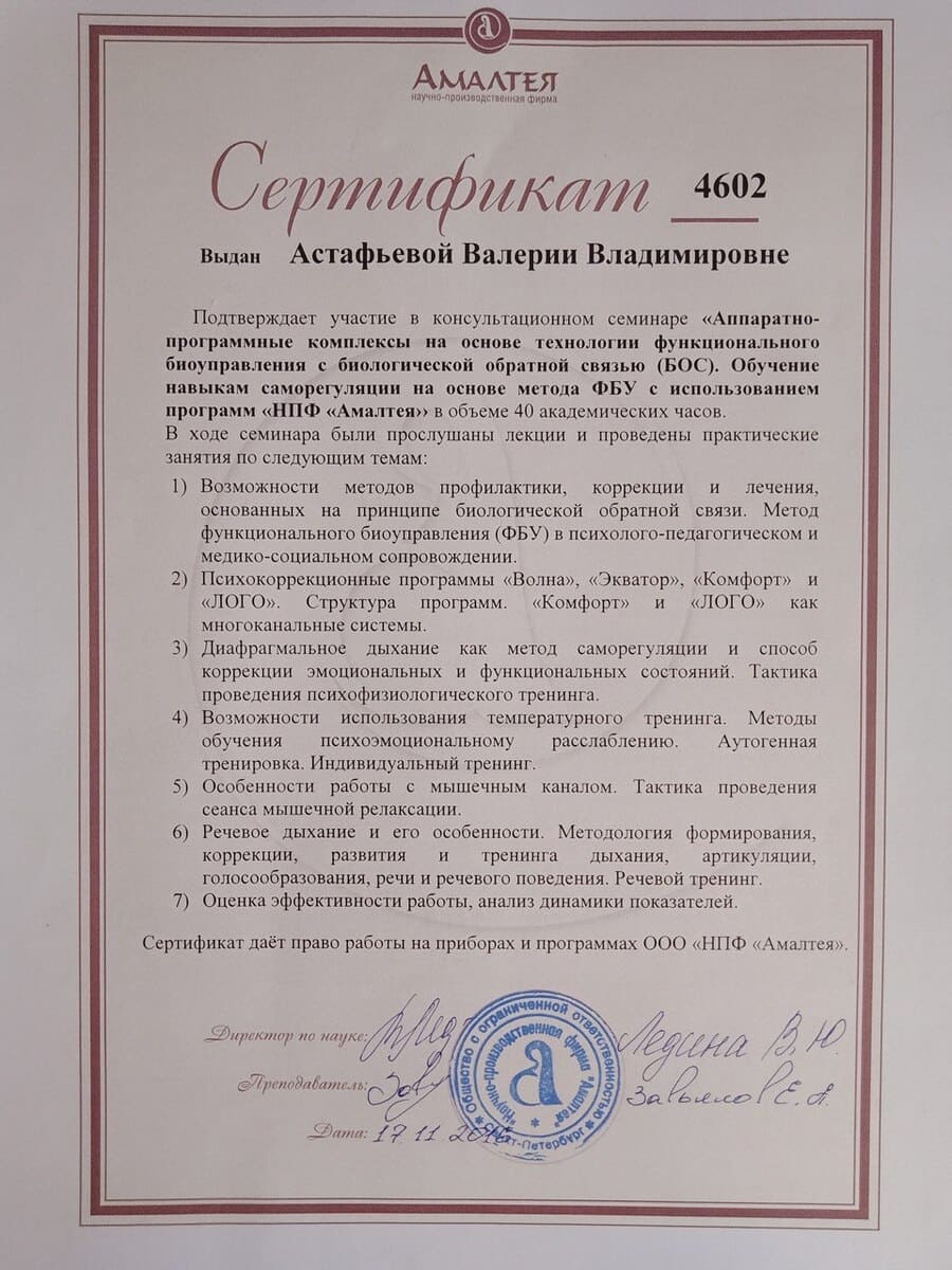 - 2016 г. – «Амалтея». Консультативный семинар «Аппаратно — программные комплексы на основе технологии функционального БОС. Обучение навыкам саморегуляции на основе метода ФБУ с использованием программ «НПФ «Алматея».