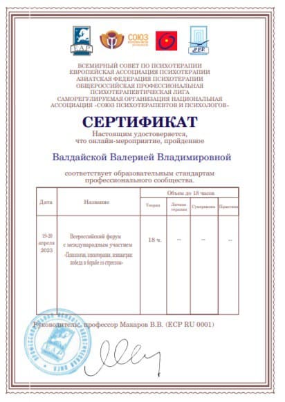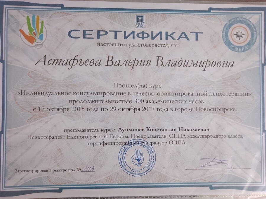 - 2015 — 2017 г. Удостоверение «Телесно-ориентированная психотерапия в индивидуальном консультировании» (специалист в сфере Телесно-ориентированной психологии).