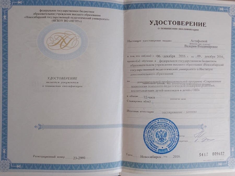 - Активный участник с 2016 по 2017 семинаров от центра переподготовки НГПУ, выездных семинаров «Ринолалия», «Дети с нарушенным слухом, особенности работы в работе психолога и логопеда. (в том числе кохлеарный имплант)», «Современные технологии психолого-педагогической поддержки родителей воспитывающих детей – инвалидов и детей с ОВЗ» и др.